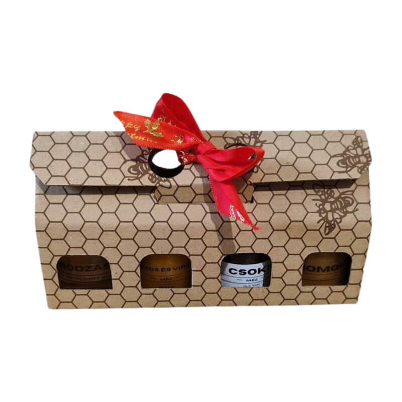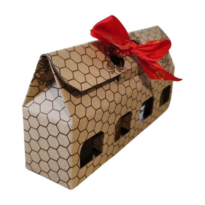 A házikó alakú doboz méhsejt mintával és dekoratív piros szalaggal készül – így a csomag azonnal ajándékozható, nem igényel külön csomagolást.
