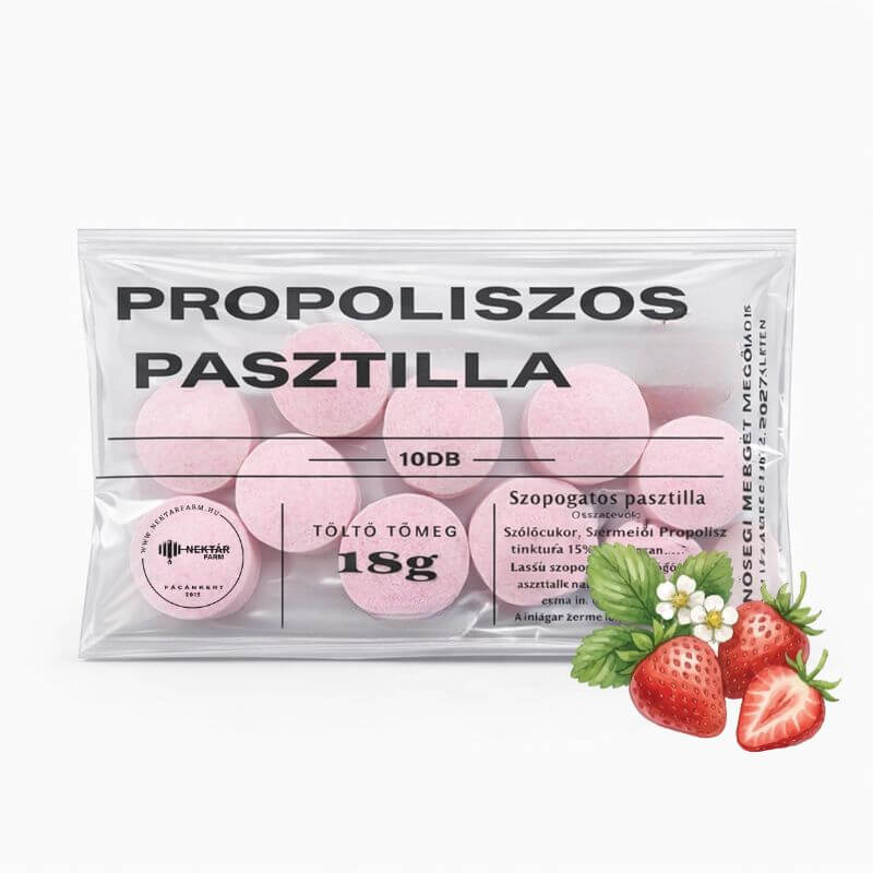 A propoliszos pasztilla epres ízesítéssel egy természetes alapú, szopogatós pasztilla, amely termelői propolisz és liofilizált (fagyasztva szárított) eper hozzáadásával készül. A gondosan válogatott összetevők harmonikus ízvilágot alkotnak, miközben a propoliszt hagyományosan az immunrendszer támogatására és a torok komfortérzetének fenntartására használják.